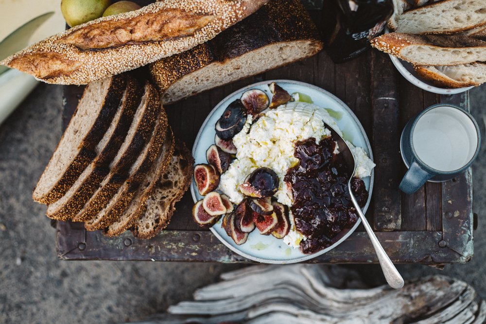 3: Scoop the ricotta onto a plate and arrange the jam and figs on and around it. Drizzle the honey seeds over the top and serve with the hot toast.