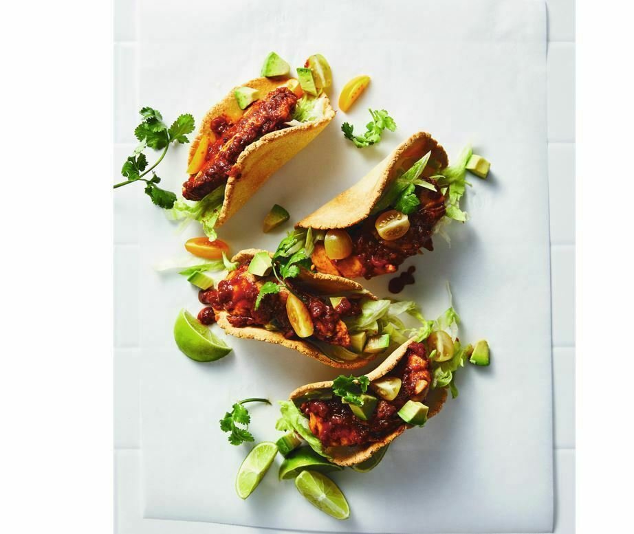 To serve, load up the taco shells with the shredded iceberg, chicken, avocado, cherry tomato and coriander. Add a squeeze of lime juice and you’re good to go.