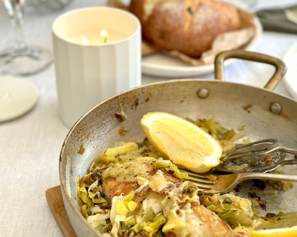 With Spring around the corner, it’s time to lighten up your meals. Like this recipe for Pan-fried Fish with Leek, Preserved Lemon and Tahini – which spotlights a lighter source of protein, in season vegetables and a delicious (and immune boosting!) citrusy finish.